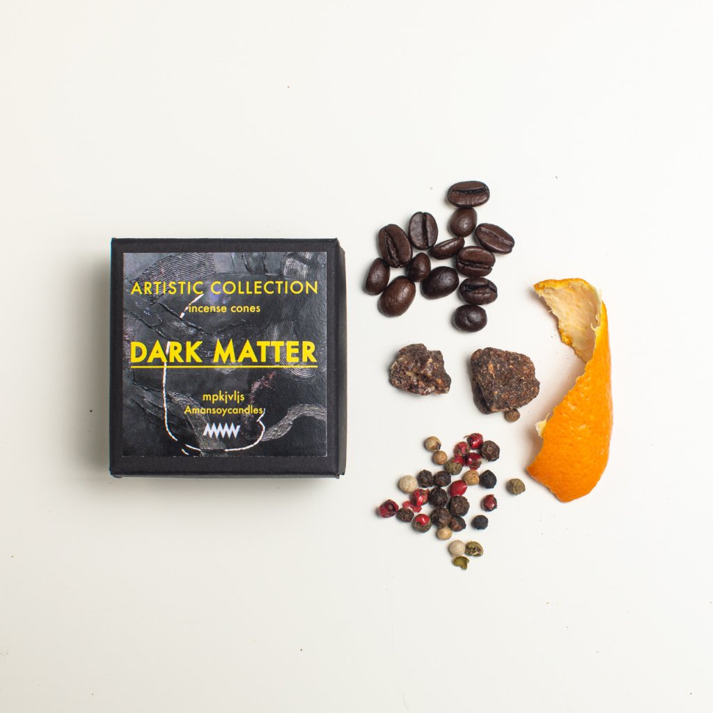 Vůně vznikla jako součást kolekce nábytku a bytových doplňků našeho artistického uskupení MPKJVLJS. Již z názvu je jasné, že jsme se inspirovali temnou hmotou ve vesmíru. Do této vůně jsem se snažila promítnou temnotu, a proto jsem ji založila na temných vonných hmotách a silicích. Ve vůni je dokonce rozpuštěna opravdová vonná pryskyřice.